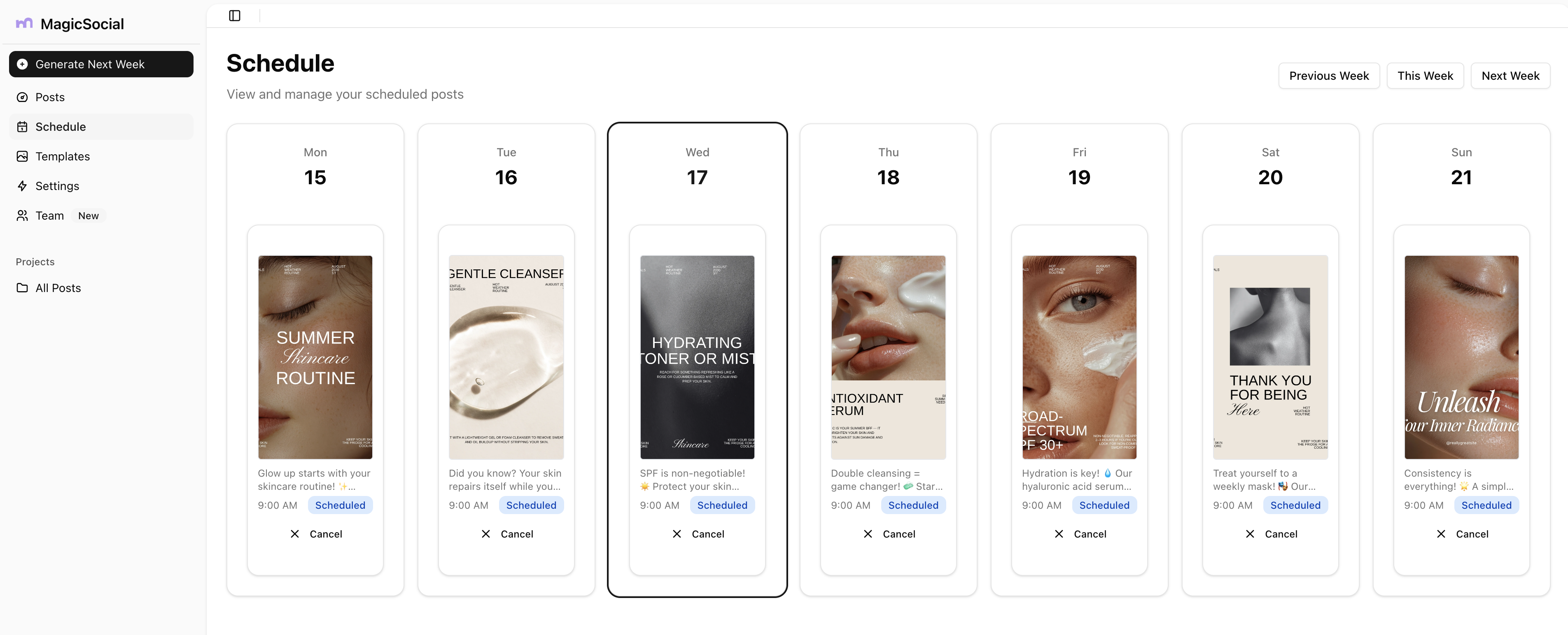 Select reference posts from our library, or bring your own by adding your Instagram URL. We'll use these to create consistent, on-brand content for you.